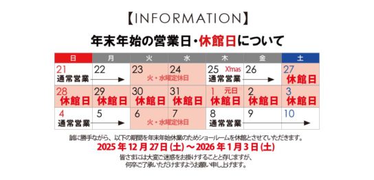年末年始のショールーム営業日・休館日のお知らせ