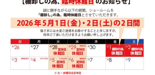 誠に勝手ながら、5/1(金)・2(土)を棚卸しの為「臨時休館日」、ショールームを