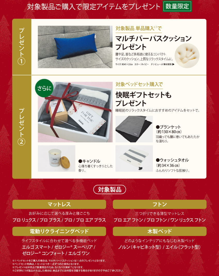 マットレスorフトン+電動リクライニングベッドor木製フレームをセットでご購入で「マルチパーパスクッション」に加えさらに「オリジナル ギフトセット」プレゼント